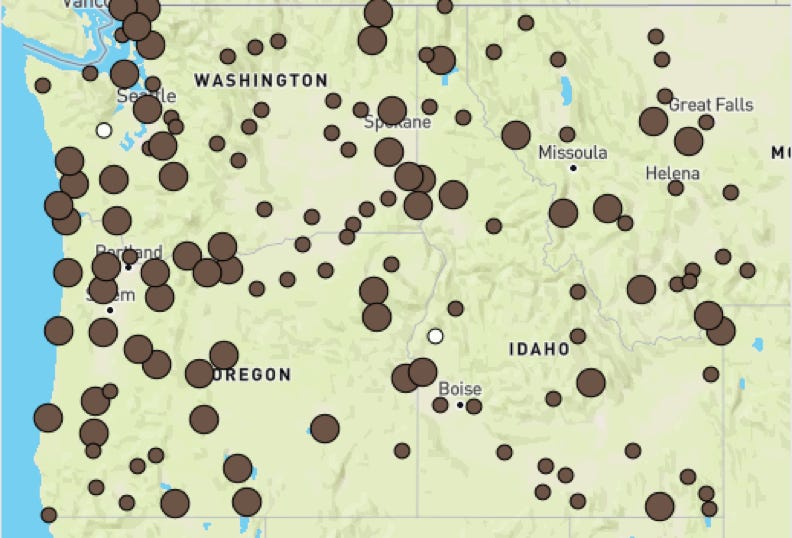 Summer precipitation trends are also observable in all stations within western Washington. Brown color represents decreases in summer precipitation from 1980-2023, with sizes of circles representing the statistical significant of these drought conditions. Within this same time period, the Vancouver, WA station has recorded a 24.5% decrease in average summer precipitation.